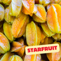 The starfruit (Averrhoa carambola) is usually available in Mauritius from October to March, during the tropical summer season. This yellowish-green, star-shaped fruit has a slightly sweet, sour taste and is eaten as a refreshing snack or as an ingredient in juices.