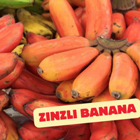 The zinzli banana, a small, sweet banana variety, is grown in Mauritius all year round, but is most abundant in the warmer months, mainly between October and March. This banana has a particularly rich flavour, thin skin and size, making it ideal for fresh consumption or as a snack. It comes in yellow and pink varieties.