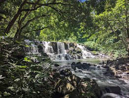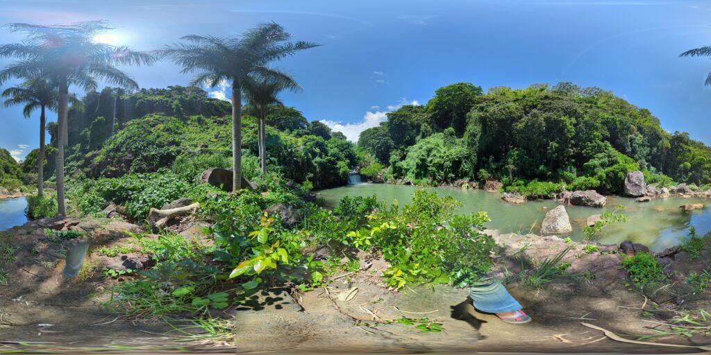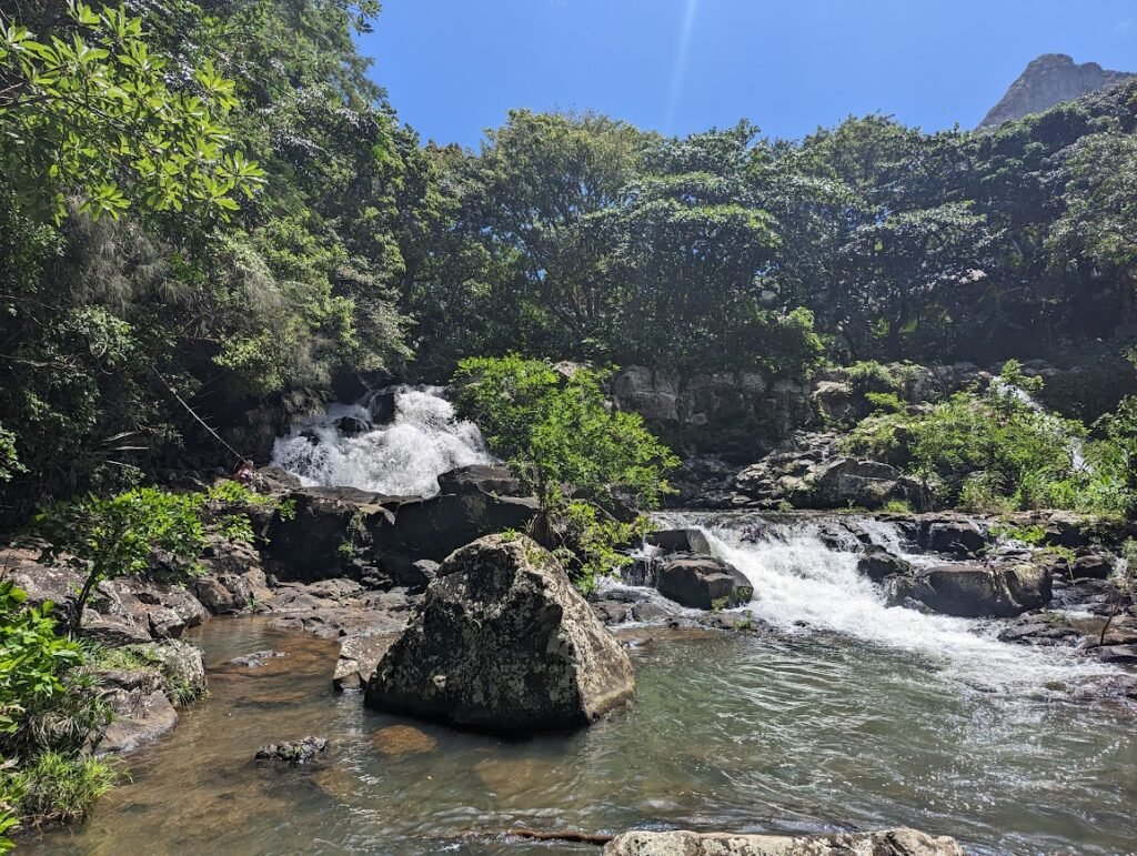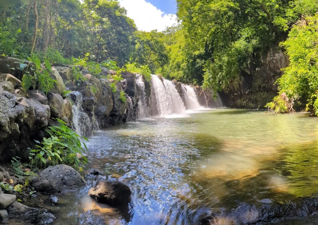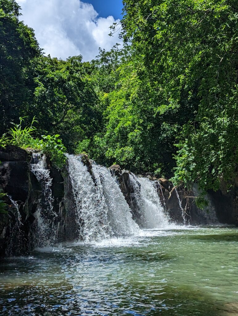 The trail to the waterfalls begins at the edge of the garden. It isn’t a long hike, maybe twenty minutes each way, but it’s a lovely one. The path winds through ferns and roots, dipping down toward the Moka River. There are four waterfalls altogether, each with its own mood. The first is calm, hidden in vines. The second has a round basin perfect for cooling off. The third one, named Bassin Arc-en-Ciel, shimmered when the sun hit it just right. And the last, often called Eureka Falls, tumbles in sheets across dark basalt rock. It’s not a dramatic drop, but it’s intimate and alive, especially when the dragonflies circle.